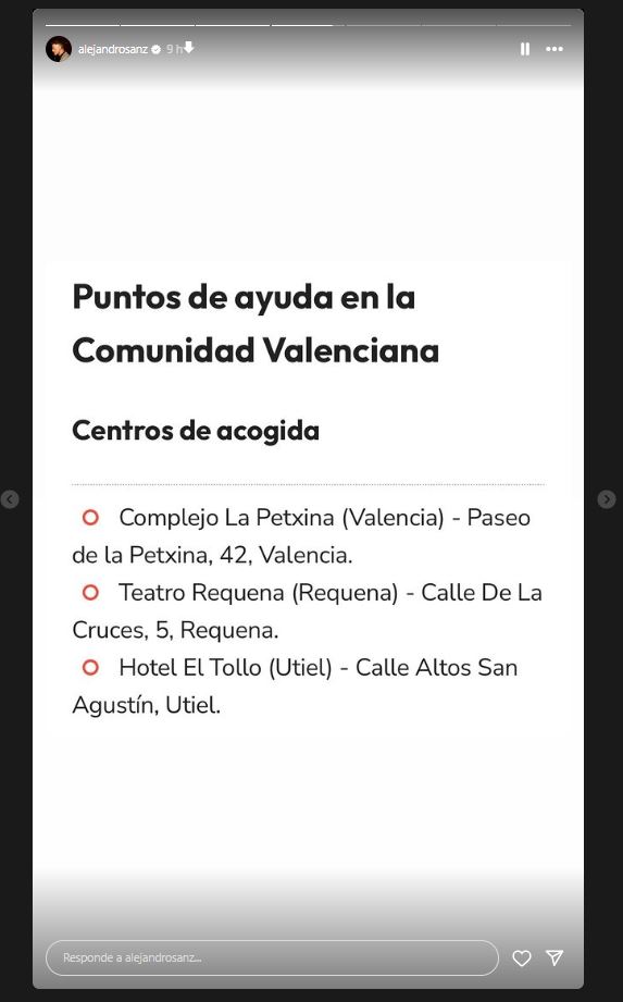 Además, Alejandro Sanz también compartió a través de sus historias de su perfil en Instagram información de interés público como los puntos de ayuda en la Comunidad Valenciana, o las zonas habilitadas para alimentos y ropa.