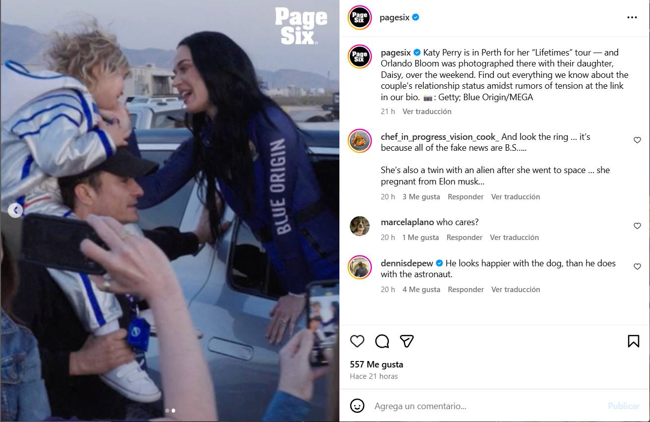 Sin embargo, siente que ha recibido poco apoyo por parte de su marido. La persona contó a Page Six que Katy y Orlando discutieron a raíz de su presencia en la misión NS-31 de Blue Origin.