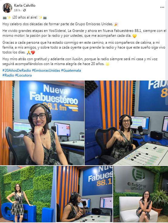 Con emoción y gratitud, la locutora guatemalteca Karla Calvillo celebró dos décadas de carrera en la radio, un medio que ha sido su casa y escenario profesional desde sus primeros pasos hasta hoy.