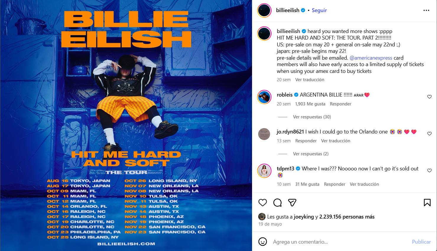 En 2024, lanzó su tercer álbum, Hit Me Hard and Soft, con sencillos exitosos como "Birds of a Feather", que alcanzó el #1 en Billboard Global 200.