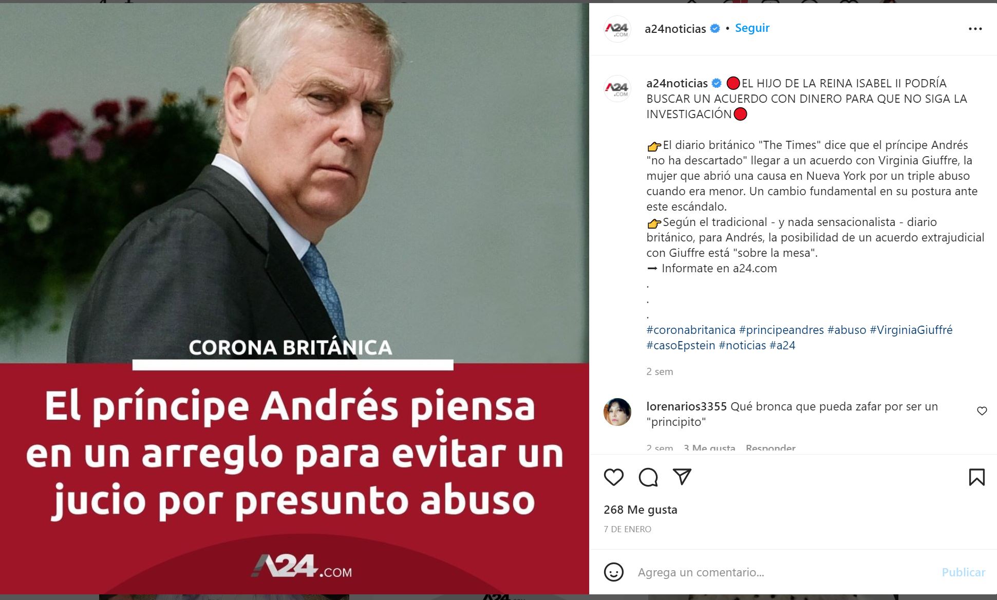 Virginia aseguró en la demanda que el difunto magnate Jeffrey Epstein la traficó y la obligó a tener relaciones sexuales con sus amigos, incluido el príncipe Andrés, y que éste sabía que ella era menor de edad (tenía 17 años) en ese momento.