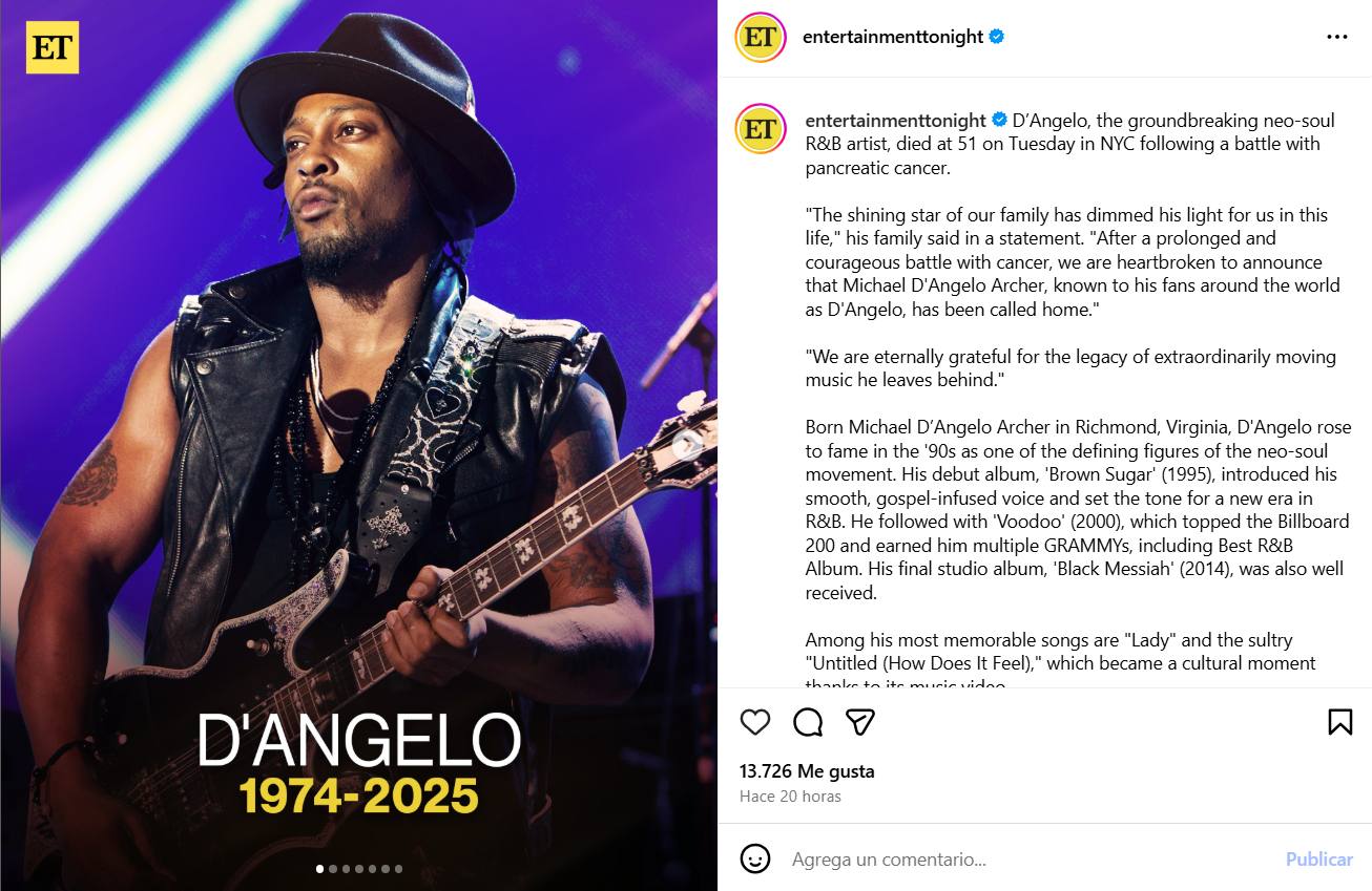 "La estrella brillante de nuestra familia ha apagado su luz en esta vida... Tras una larga y valiente batalla contra el cáncer, nos duele anunciar que Michael D’Angelo Archer, conocido por sus fans de todo el mundo como D’Angelo, ha sido llamado a casa, dejando esta vida hoy, 14 de octubre de 2025″, revelaron sus familiares en un comunicado público.