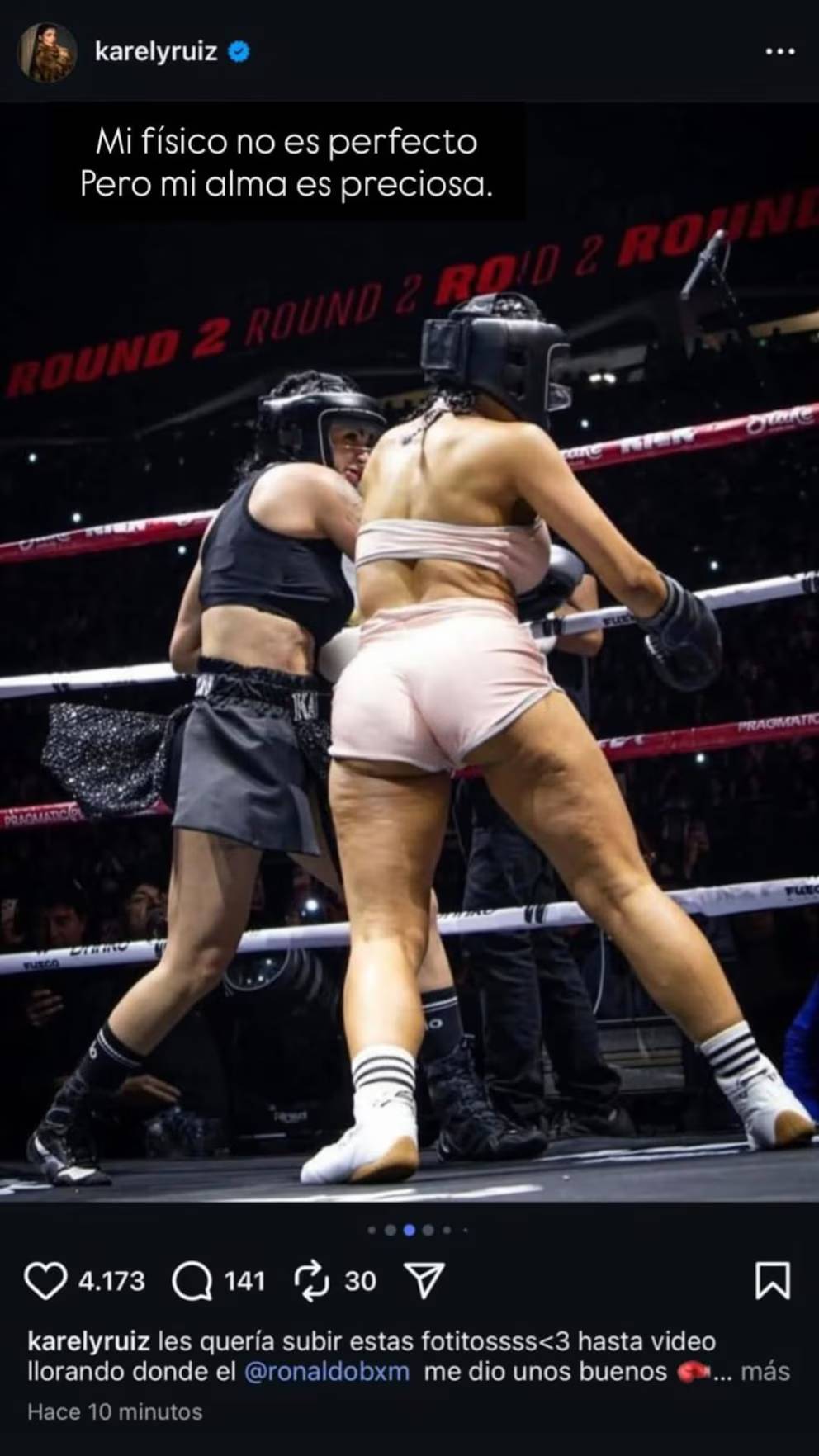 Tras la pelea, Karely Ruiz compartió una galería de imágenes del evento. Una de ellas enfocaba las piernas de García en un mal ángulo, ya que se veía celulitis en sus muslos.