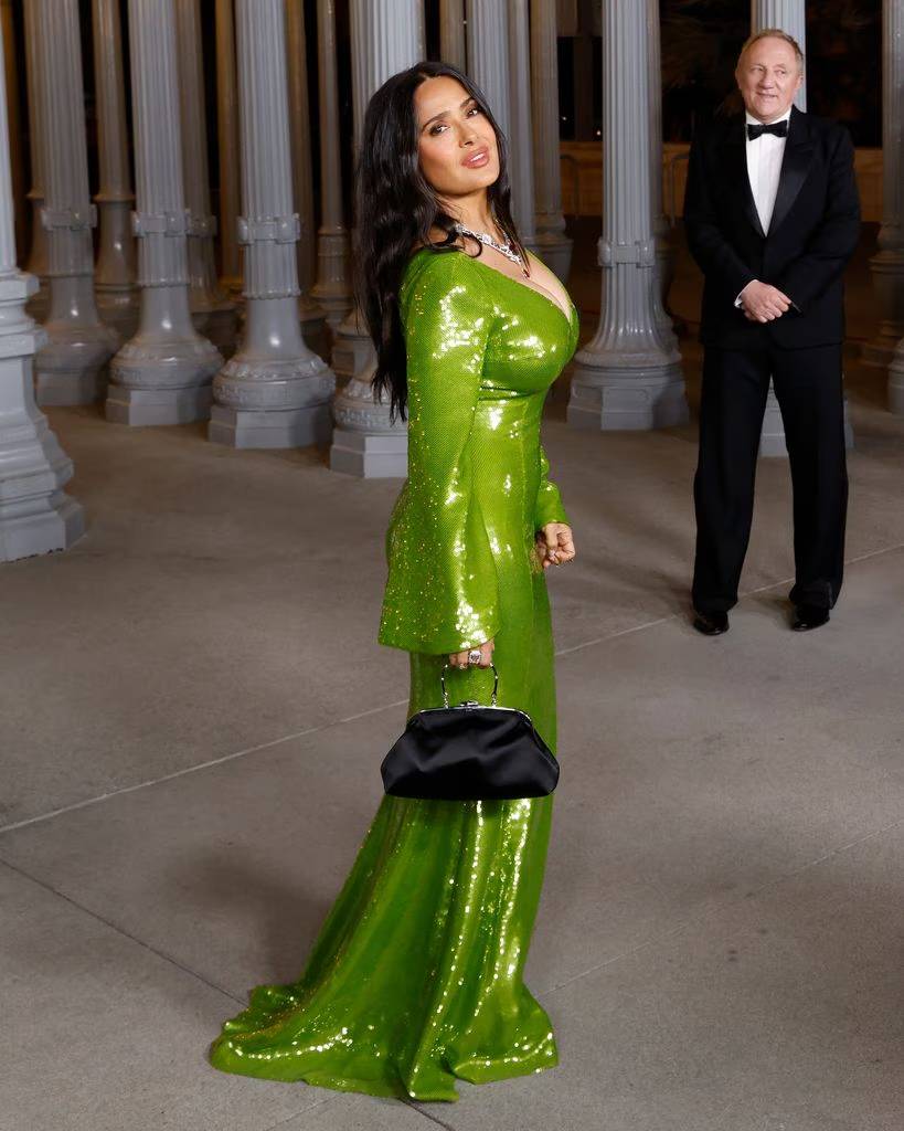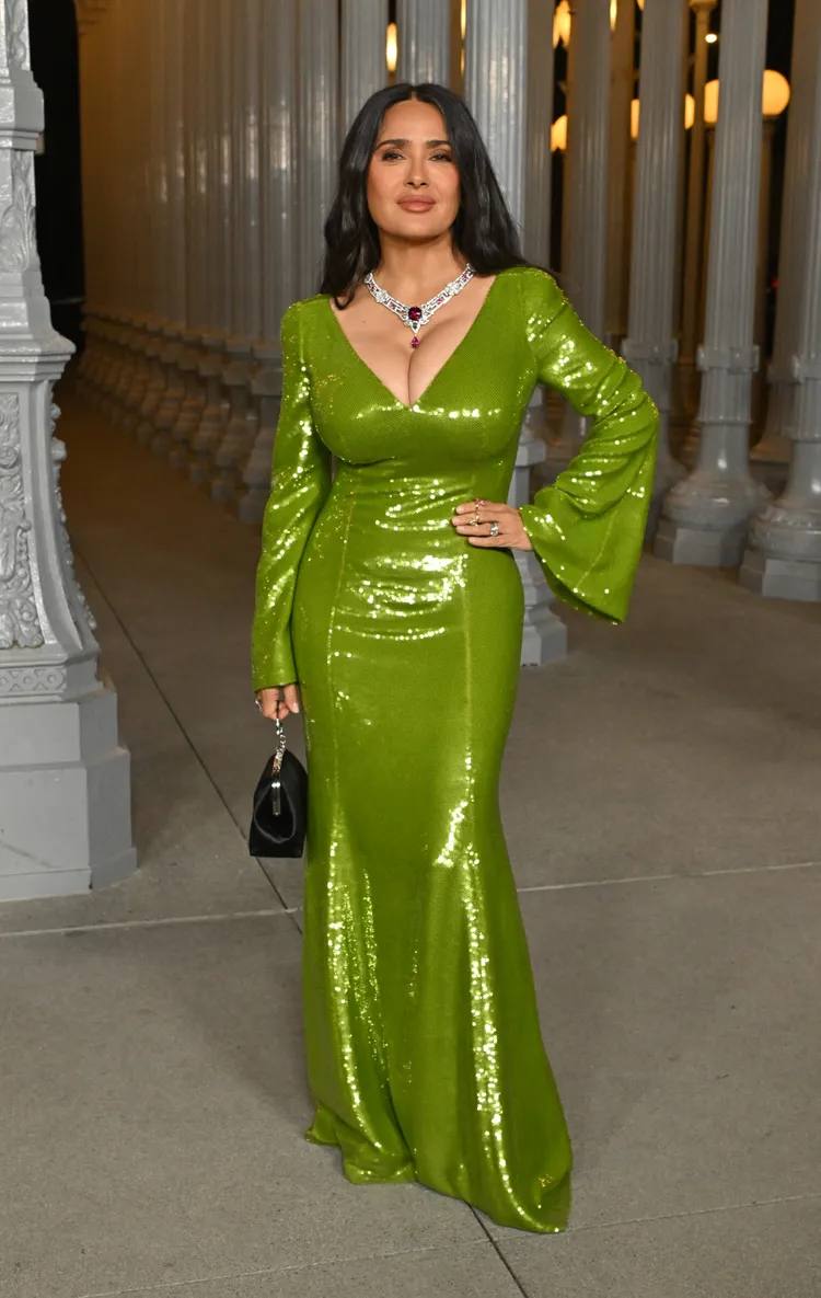 El verde lima, lejos de ser una elección convencional, fue el gran protagonista de la noche. En medio de una paleta dominada por tonos metálicos y negros, Salma Hayek apostó por un tono vibrante, casi eléctrico, que evocaba tanto la frescura como el lujo