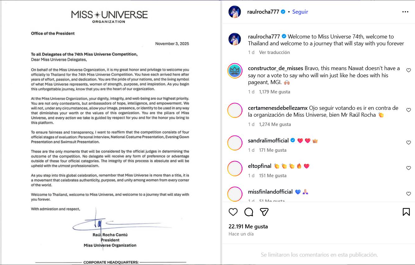 En su mensaje, publicado en la cuenta oficial del concurso, Raúl Rocha expresó su solidaridad y apoyo incondicional a las 122 delegadas de la 74.ª edición de Miss Universo y aseguró que no permitirá que se vulneren los valores de respeto y dignidad hacia las mujeres.