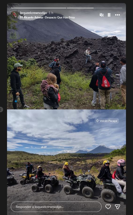 A través de las historias de Instagram de la cuenta "Lo que el crew no dijo", se compartieron imágenes donde se observa al grupo recorriendo los senderos de lava solidificada, admirando las vistas del volcán y disfrutando del paisaje.