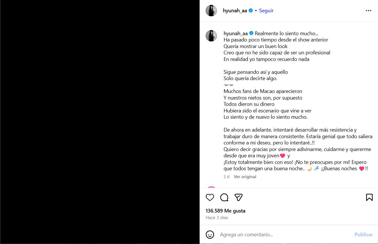 Después de ser atendida y recuperarse durante algunas horas, Hyuna recurrió a Instagram para dirigirse a sus seguidores y pedir disculpas por no poder terminar su actuación en el festival.