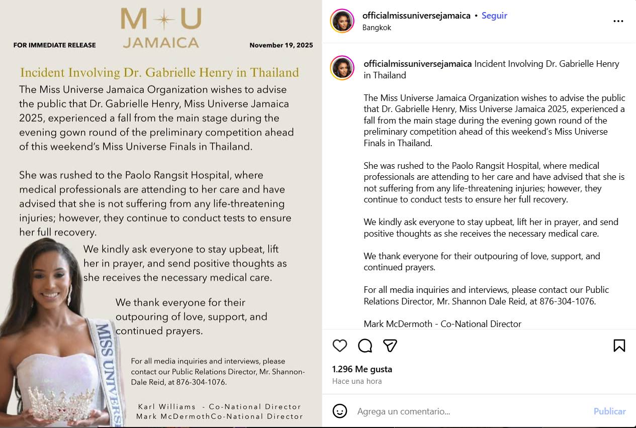 Horas más tarde, la organización Miss Universo Jamaica confirmó su estado a través de un comunicado oficial.