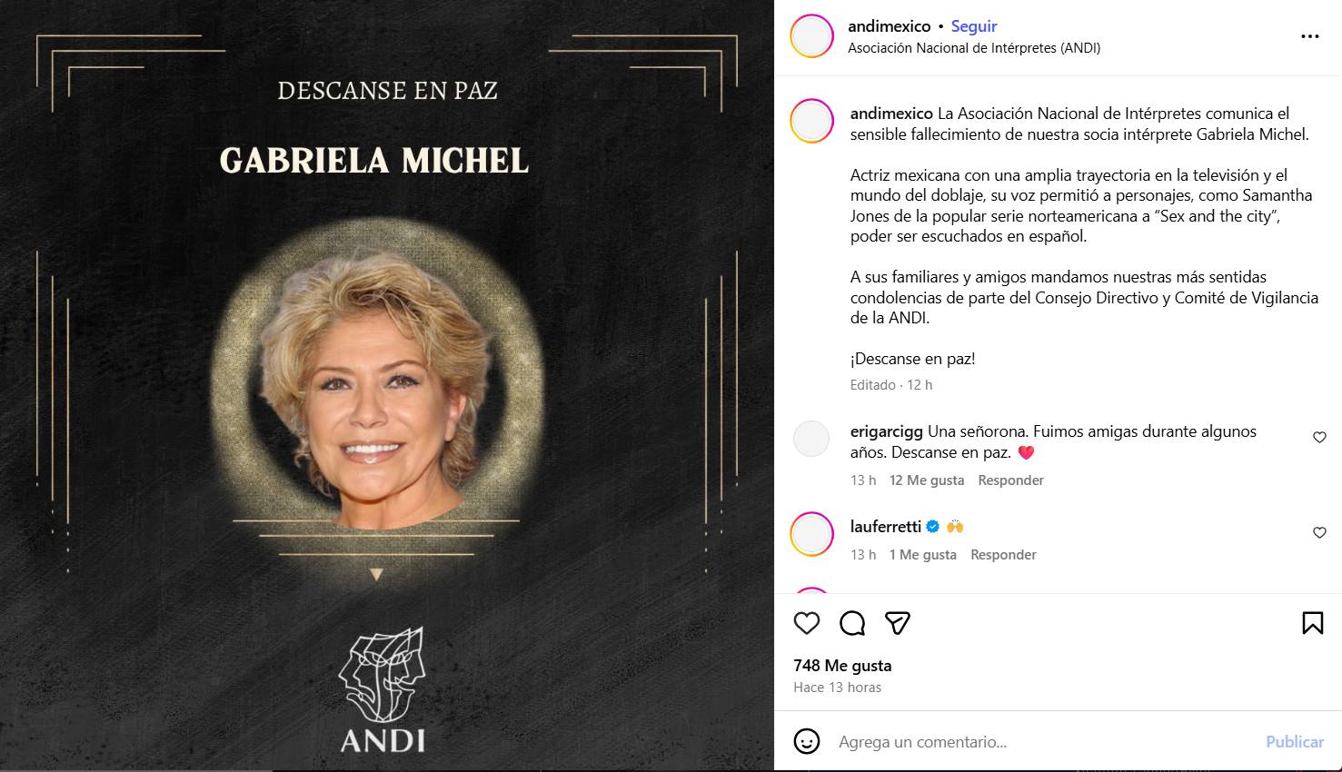 La Asociación Nacional de Intérpretes (ANDI) confirmó el fallecimiento de Gabriela Michel, madre de la actriz Aislinn Derbez y exesposa de Eugenio Derbez, a los 65 años de edad.
