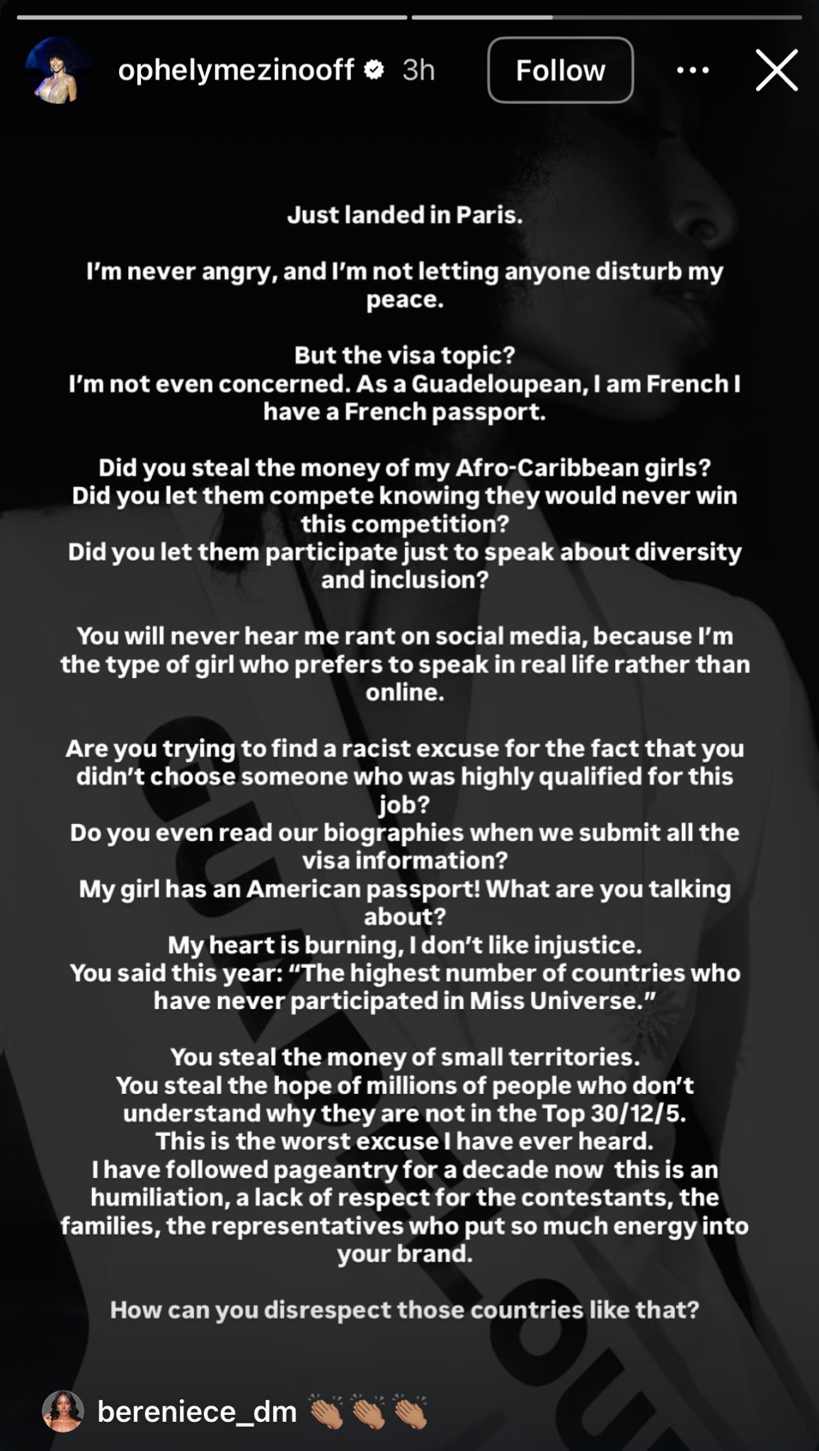 "¿Les robaste el dinero a las chicas afrocaribeñas? ¿Las dejaste competir sabiendo que nunca ganarían? ¿Intentas buscar una excusa racista para no elegir a alguien altamente calificada para este trabajo? Le robas el dinero a territorios pequeños. Admiro muchísimo a las chicas, a las familias y a los representantes que pusieron tanta energía en su institución. ¿Cómo pueden faltarle el respeto a esos países de esa manera?".