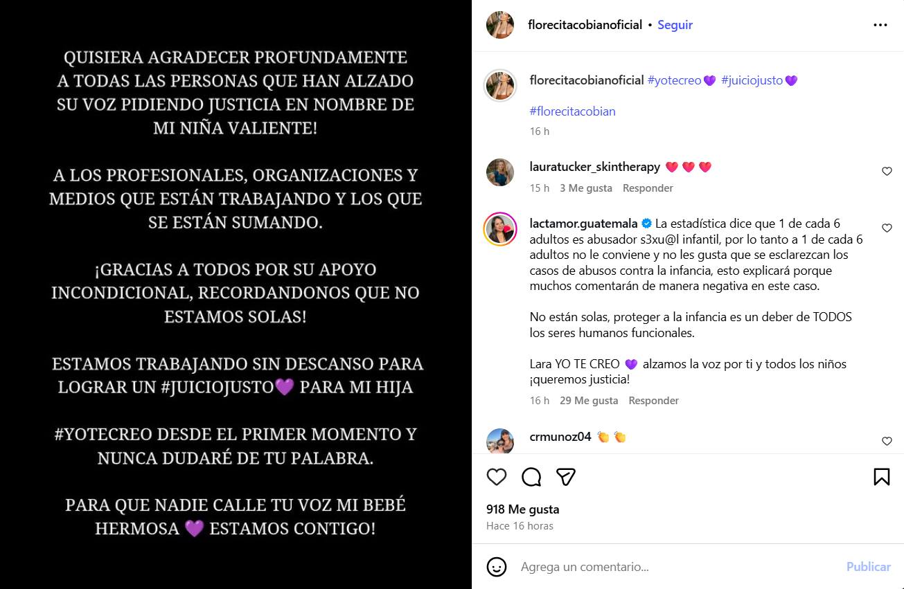 A través de su cuenta de Instagram, Florecita Cobián agradeció el apoyo recibido por profesionales, organizaciones y medios que han estado trabajando en el caso de su hija.