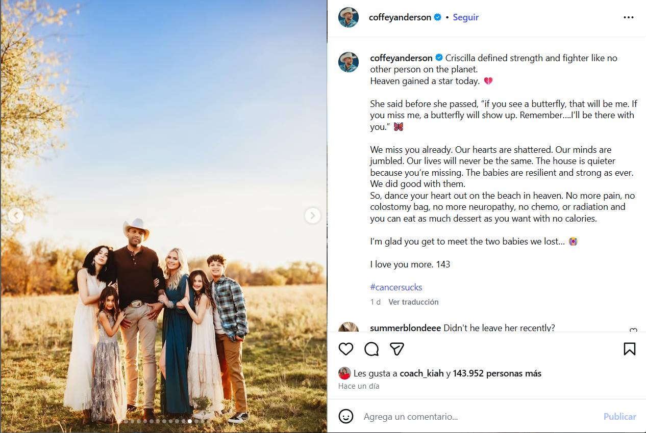 Tras su muerte, Coffey, quien se casó con Criscilla en 2009, antes de solicitar el divorcio en 2022, la honró con un emotivo homenaje compartido en las redes sociales.