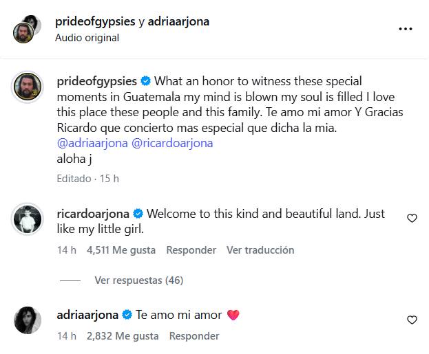 " Qué honor presenciar estos momentos especiales en Guatemala. Me encanta este lugar, esta gente y esta familia. Te amo, mi amor. Y gracias, Ricardo, que concierto más especial que dicha mía. @adriaarjona @ricardoarjonaaloha j", expresó.