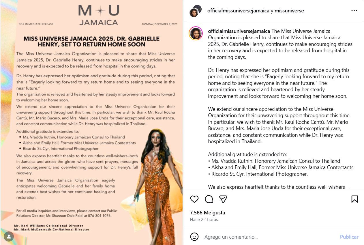 Ante la gravedad del diagnóstico, la organización Miss Universo dio a conocer que Miss Jamaica será trasladada de vuelta a su país natal para continuar con su tratamiento.