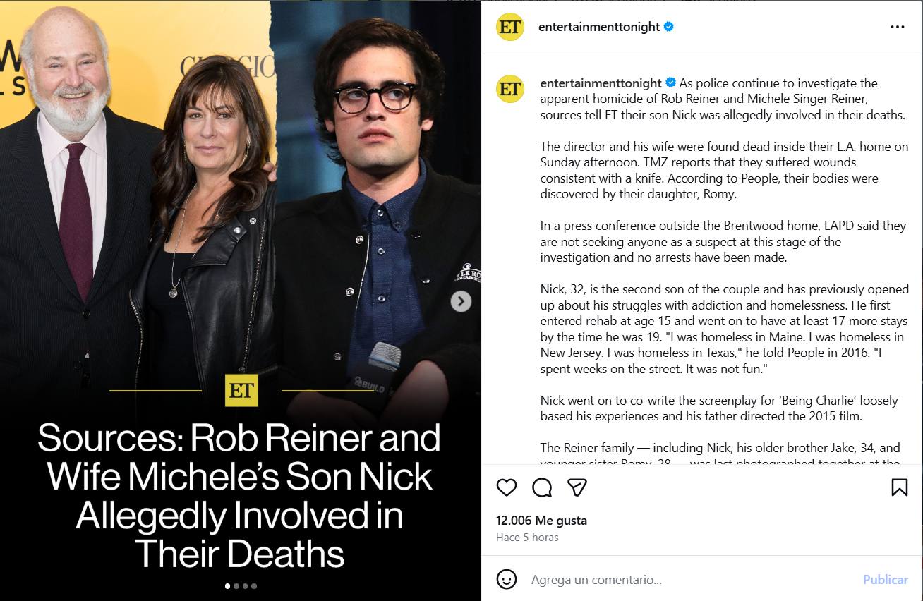 La muerte violenta de Rob Reiner y su esposa Michele Singer ha generado una ola de conmoción, mientras la policía de Los Ángeles investiga el caso como un homicidio y la revista People señala que el presunto responsable sería su hijo mediano, Nick, de 32 años.