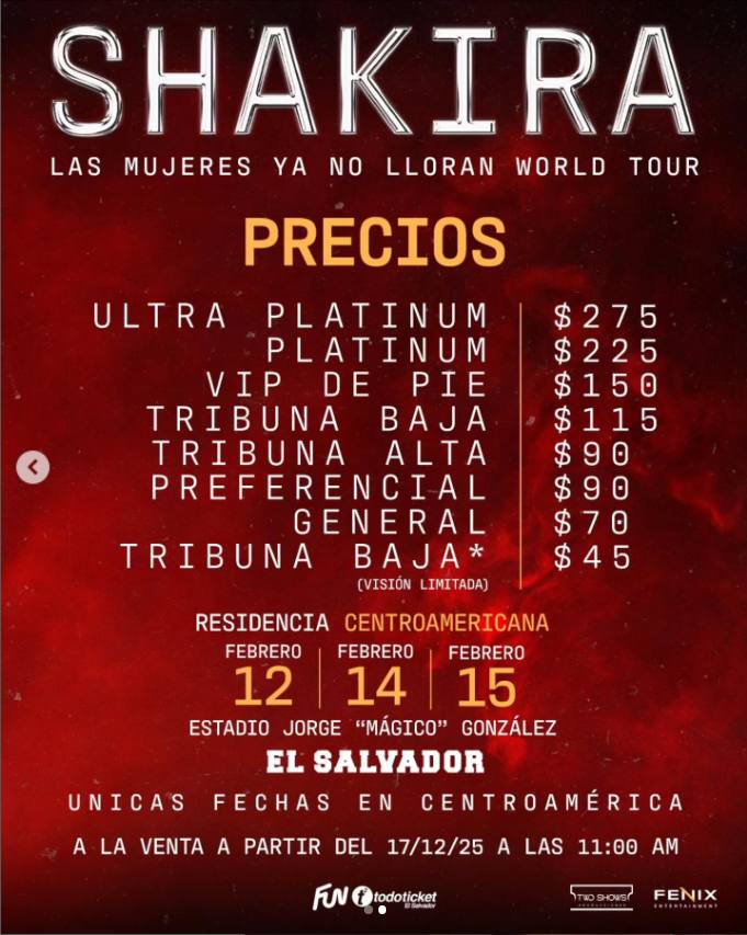 La venta de las entradas para los tres conciertos inicia el miércoles 17 de diciembre a las 11:00 a.m. a través de Fun Capital y Todo Ticket. Acá te dejamos los precios y localidades de los conciertos de Shakira en El Salvador: