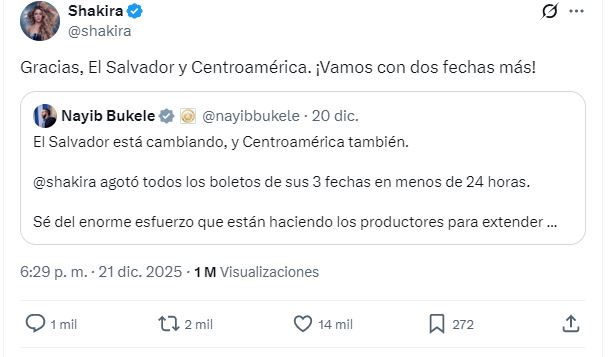 Horas después, Shakira respondió de manera directa en sus redes sociales: "Gracias, El Salvador y Centroamérica. ¡Vamos con dos fechas más!", confirmando así la ampliación del calendario.