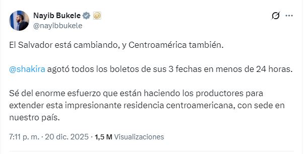 "El Salvador está cambiando, y Centroamérica también. Shakira agotó todos los boletos de sus 3 fechas en menos de 24 horas. Sé del enorme esfuerzo que están haciendo los productores para extender esta impresionante residencia centroamericana, con sede en nuestro país", escribió el presidente.