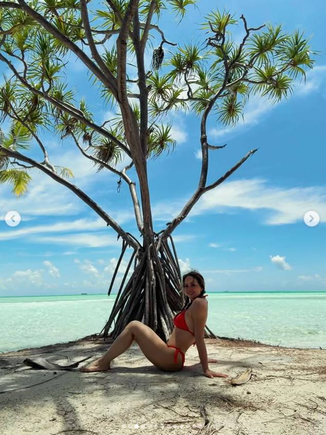 En su cuenta oficial de Instagram, la conductora mostró imágenes donde aparece con un bikini rojo de dos piezas. La prenda destaca por sus holanes y un delicado bordado en la parte superior, mientras que la parte inferior se ata a los costados, realzando su silueta.