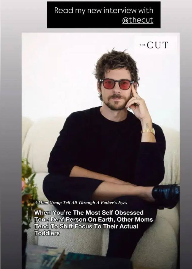 Compartió una historia de Instagram en la que aparecía él mismo editado con Photoshop sobre el cuerpo de Tisdale de su sesión de fotos Cut, recreando la imagen de ella sentada en un sofá blanco con un atuendo completamente negro y gafas de sol color rosa.