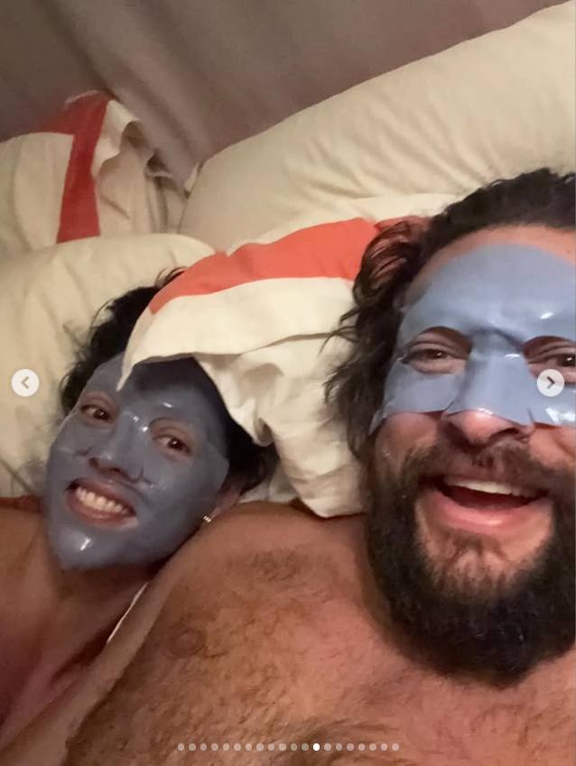 En las imágenes, aparece Jason Momoa antes de subir al avión junto a Adria Arjona. Pero sin duda una foto que acaparó la atención es donde aparece juntos en la cama y con una mascarilla en el rostro, demostrando la complicidad y el amor que hay entre ellos.