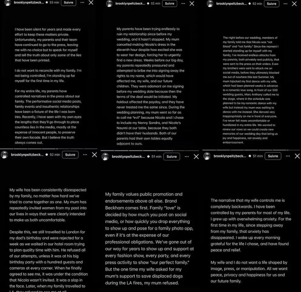 Brooklyn Beckham concluyó su mensaje con una declaración sobre su vida actual: "Desde que elegí distanciarme, siento paz y alivio. Mi esposa y yo no queremos una vida diseñada por la imagen, la prensa o la manipulación. Solo buscamos paz, privacidad y felicidad para nosotros y nuestra futura familia".