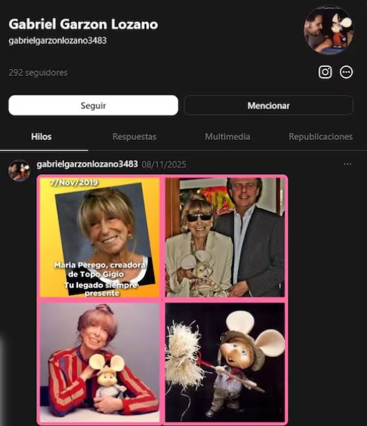 En la plataforma Threads, su publicación más reciente data de noviembre de 2025, cuando compartió un mensaje recordando a María Perego, creadora de Topo Gigio, en una fecha conmemorativa, lo que hoy resulta especialmente simbólico para los seguidores del personaje.