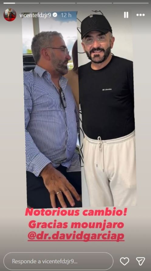 El propio Vicente Fernández Jr. compartió imágenes comparativas de su antes y después. En una de ellas aparece con una camisa de botones y un aspecto más robusto, mientras que en la fotografía más reciente, tomada en enero de 2026, se le observa notablemente más delgado y con un cambio evidente en su postura y expresión.