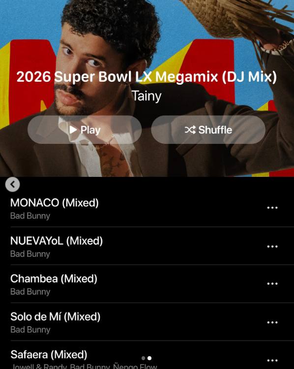 La lista compartida bajo el título "2026 Super Bowl LX Megamix (DJ Mix)" dejó ver una cuidada selección musical del puertorriqueño, lo que muchos interpretaron como una posible filtración anticipada del setlist oficial.