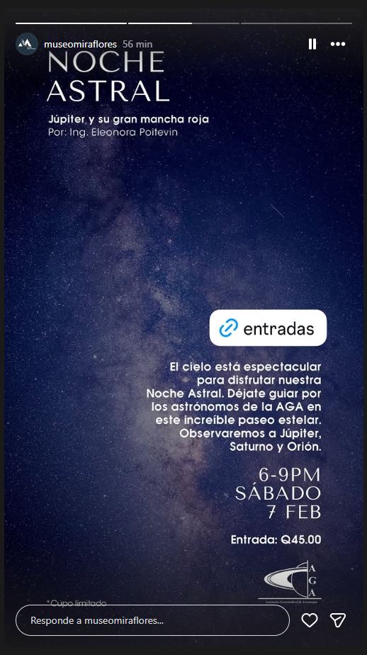 La actividad se realizará de 6:00 de la tarde a 9:00 de la noche en las instalaciones del museo, ubicado en la zona 11 de la Ciudad de Guatemala, y contará con la participación de la ingeniera Eleonora Poitevin, quien impartirá la conferencia titulada Júpiter y su gran mancha roja, enfocada en uno de los fenómenos más emblemáticos del sistema solar.