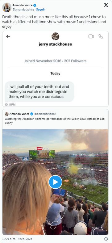 Una joven creadora de contenido asegura haber recibido amenazas de muerte tras compartir en redes sociales que no quería ver el espectáculo de medio tiempo protagonizado por Bad Bunny durante el Super Bowl. Amanda Vance, influencer con miles de seguidores, denunció públicamente el acoso luego de que su postura de rechazo al show musical generara una ola de reacciones encontradas en internet.