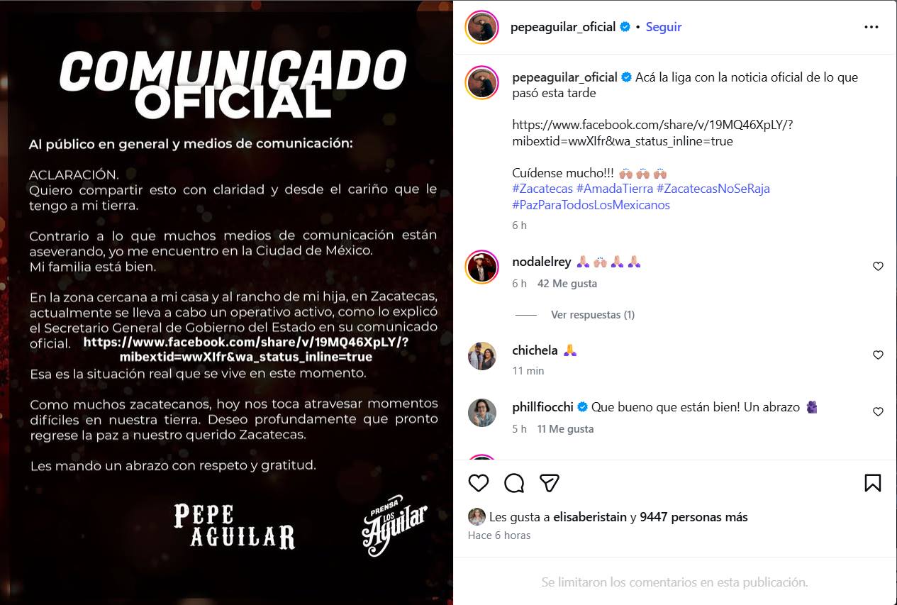 El cantante Pepe Aguilar compartió un comunicado para revelar más detalles del tiroteo ocurrido en Zacatecas.