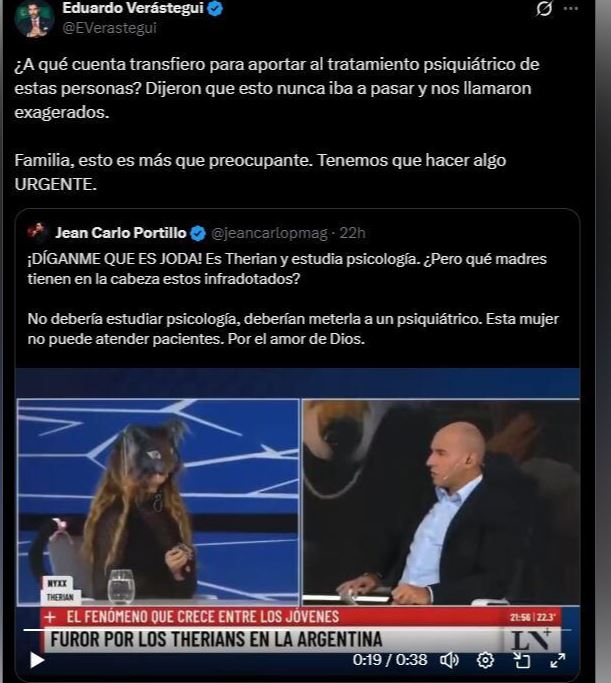 Verástegui compartió un video de una entrevista transmitida por el canal argentino La Nación Más, en la que aparece una joven que se identifica como therian. Junto al material, publicó un mensaje que rápidamente generó reacciones en redes sociales.