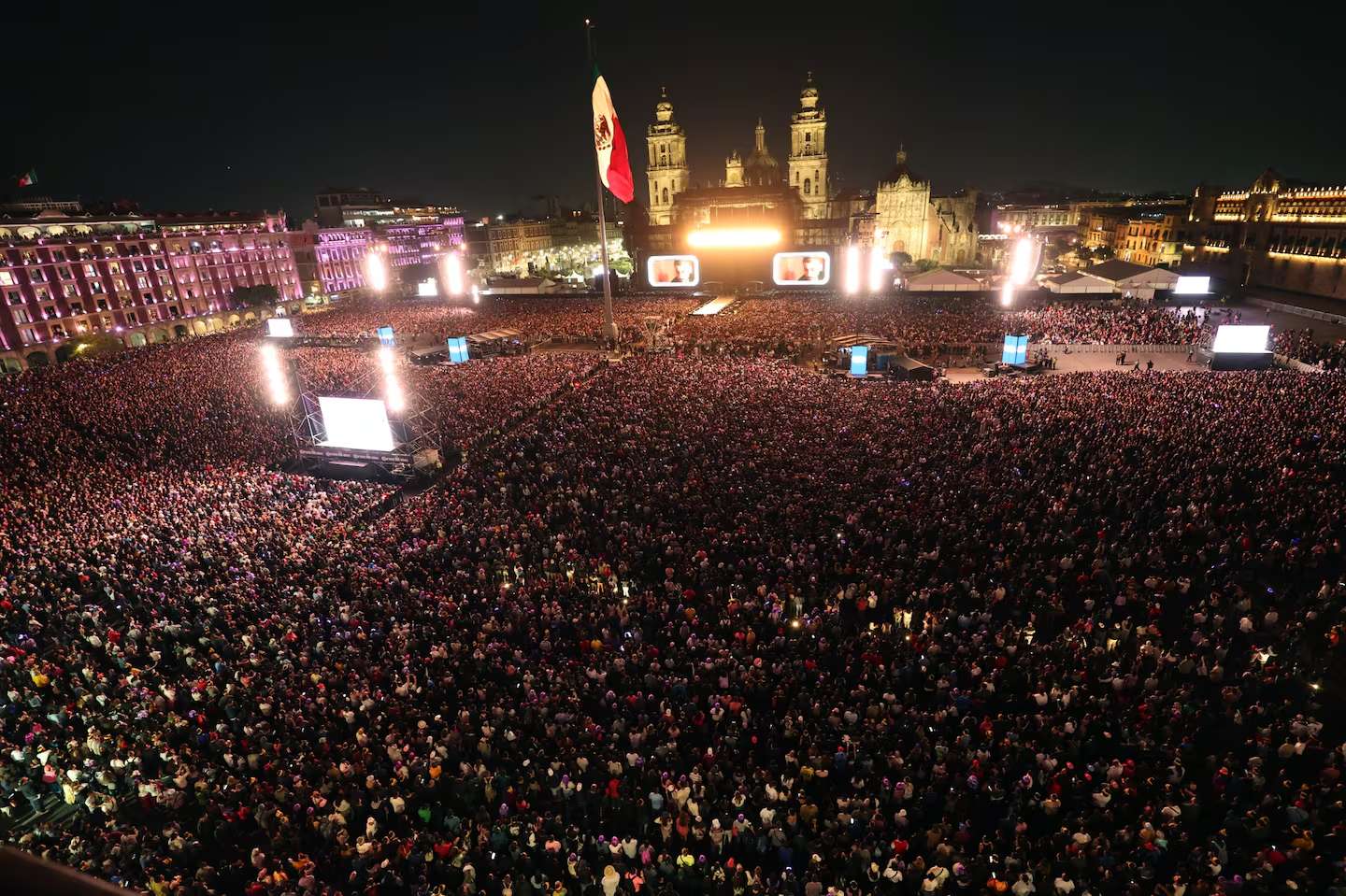 El Zócalo, uno de los espacios más significativos y cargados de memoria colectiva en México, se transformó en un mar de fanáticos. Desde días antes, seguidores de la cantante acamparon para asegurar los mejores lugares en la explanada.