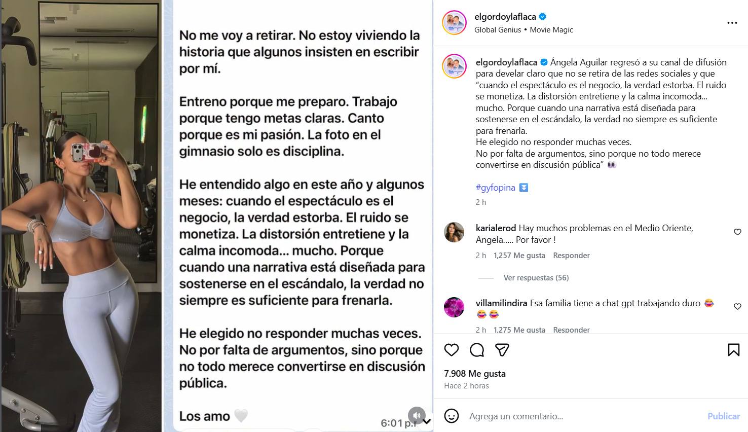 El surgimiento de especulaciones se originó tras la publicación de una fotografía en la que Ángela Aguilar aparece en un gimnasio.