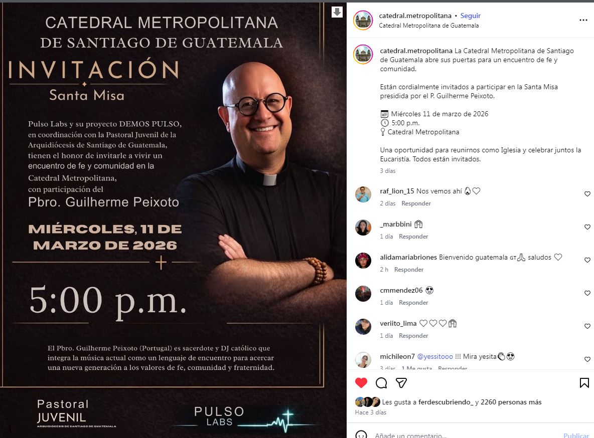 La Catedral Metropolitana de Santiago de Guatemala abrirá sus puertas para un encuentro especial de fe y comunidad encabezado por el sacerdote portugués Guilherme Peixoto, conocido internacionalmente como el DJ Padre Guilherme. La actividad se realizará el miércoles 11 de marzo de 2026 a las 5:00 p.m., según confirmaron en las redes sociales.