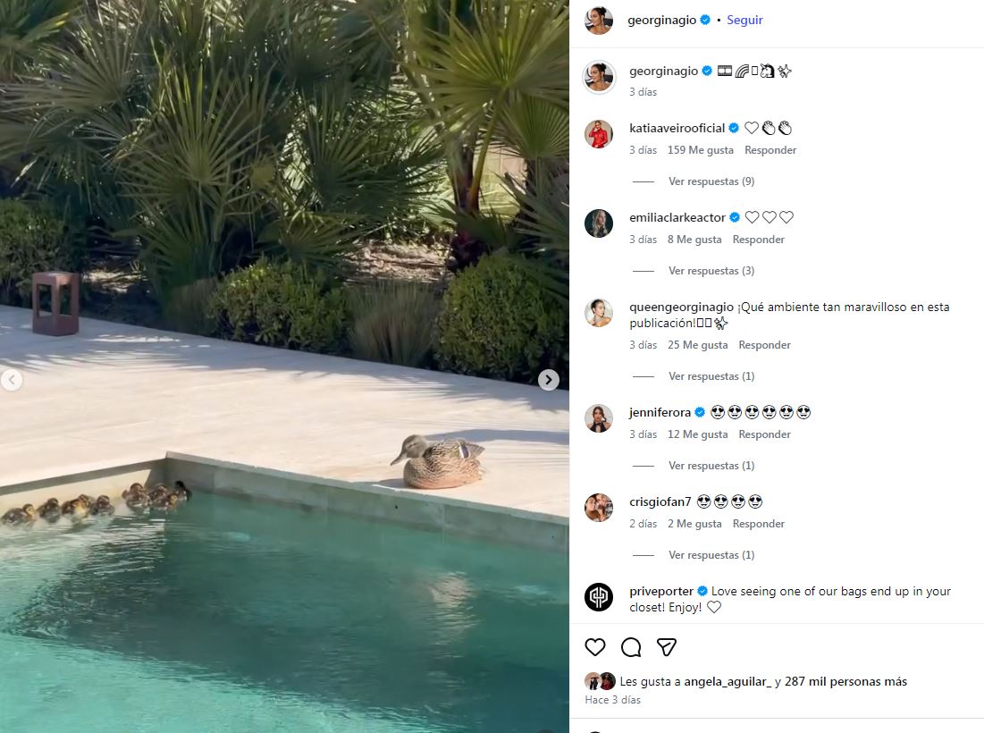 En el video publicado en su cuenta de Instagram, se observa una elegante piscina en la que no solo destaca el ambiente relajado, sino también la presencia de unos inesperados protagonistas: una familia de patos que nada tranquilamente mientras Georgina descansa cerca.