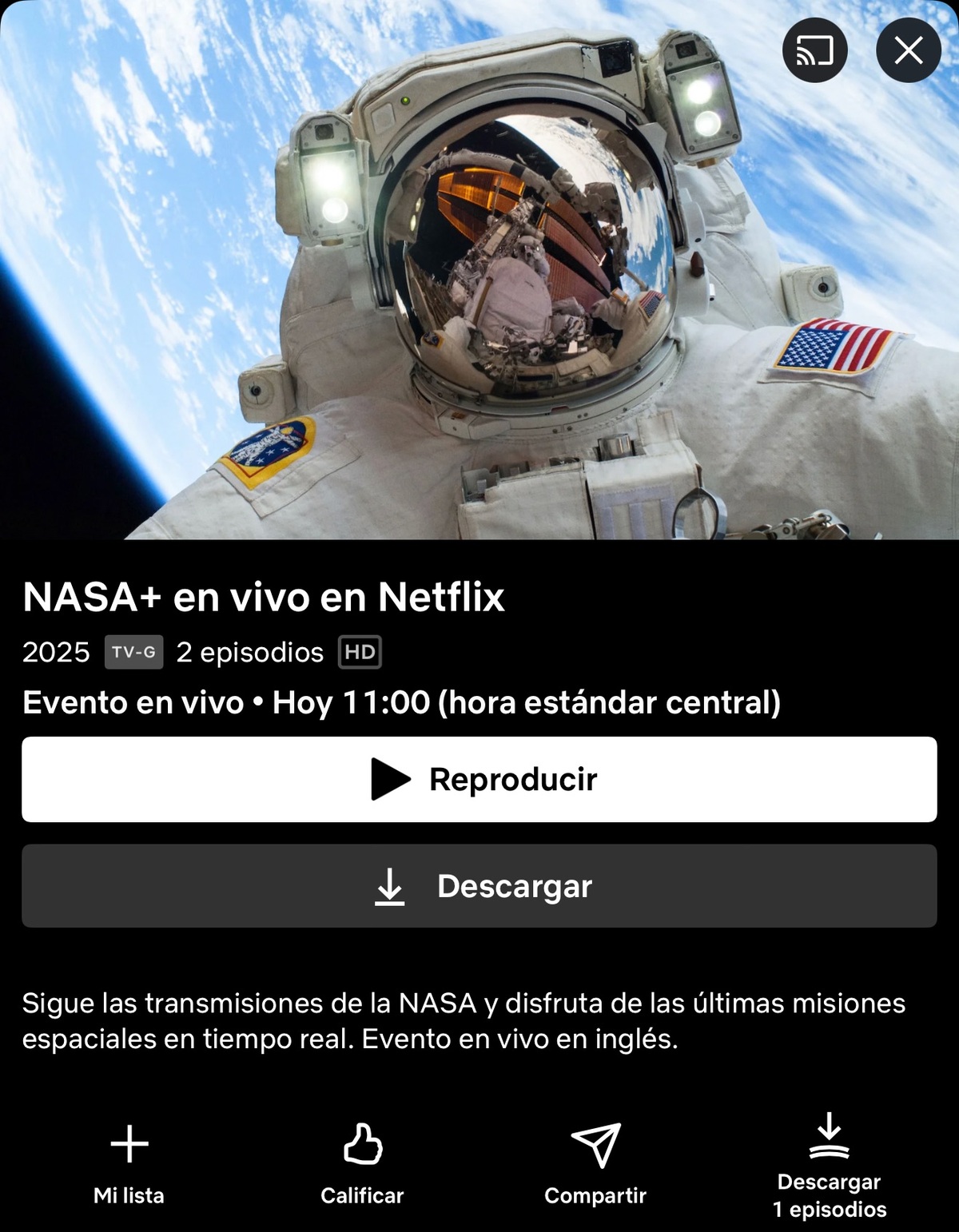 La transmisión en vivo se realizará bajo el título "NASA+ en vivo en Netflix" y comenzará a las 11:00 de la mañana (hora de Guatemala).
