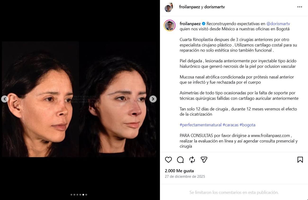 Dorismar contó que en 2023 buscó una sencilla rinoplastia para un pequeño retoque en el tabique nasal. Sin embargo, el procedimiento realizado estuvo plagado de complicaciones.
