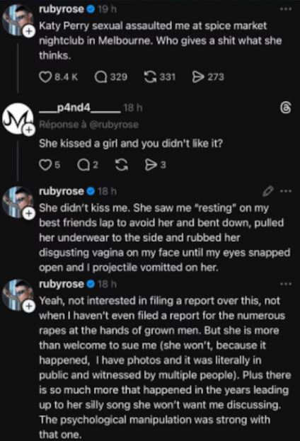 La denuncia se hizo pública tras una serie de mensajes de Ruby Rose en la red social Threads. La actriz acusó directamente a Katy Perry de haberla agredido sexualmente en el club nocturno Spice Market, en Melbourne, cuando ambas tenían poco más de 20 años.