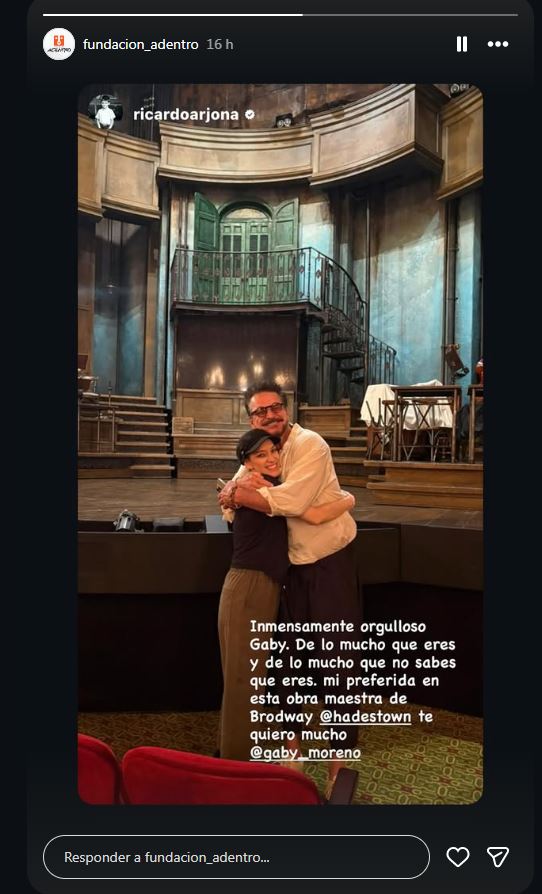 "Inmensamente orgulloso Gaby. De lo mucho que eres y de lo mucho que no sabes que eres. Mi preferida en esta obra maestra de Broadway Hadestown te quiero mucho @gaby_moreno".