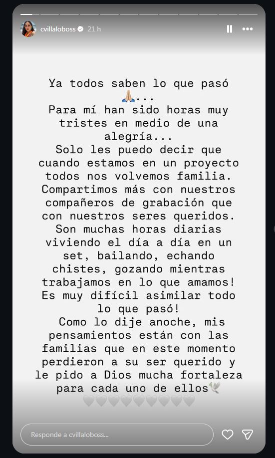 El suceso provocó reacciones inmediatas entre los protagonistas de la serie. La actriz Carmen Villalobos, quien interpreta a Catalina Santana, publicó un mensaje en sus redes sociales: "Silencio en el set. En memoria de los compañeros de SSHP que fallecieron hoy". El pronunciamiento fue replicado por Carolina Gaitán y Gregorio Pernía, quienes también expresaron su pesar.