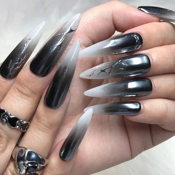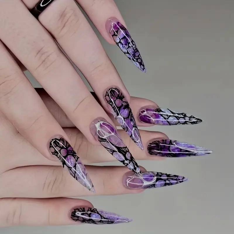 Puedes llevarlo en formato french manicure con base nude y puntas negras, o jugar con formas geométricas inspiradas en telarañas minimalistas. Es perfecto para quienes buscan un look de oficina con un guiño misterioso.